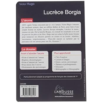 L’œuvre1833 : après l’échec rencontré par Le roi s’amuse, Victor Hugo s’entoure des meilleurs acteurs, dans un célèbre théâtre de Paris, pour faire d’une simple femme un mythe. Lucrèce Borgia triomphe, Lucrèce la monstrueuse est née. De la famille Borgia, on connaît les turpitudes et la soif de pouvoir du père et du frère. Hugo met en scène la belle jeune femme pour surpasser ses illustres parents en crimes et en luxure. Adultère, incestueuse, empoisonneuse… Peut-elle encore se racheter par la puissance de son amour pour son fils, Gennaro ?Le dossier (avant d’aborder l’oeuvre)Fiche d’identité de l’auteurRepères chronologiquesFiche d’identité de l’oeuvrePour mieux lire l’œuvreDictionnaire des personnagesPour approfondirClés d’analyseLecture d’imagesGenre, action, personnagesThèmes et prolongementsGlossaireBibliographie et filmographieParticulièrement adapté au programme de français des classes de 1ères
